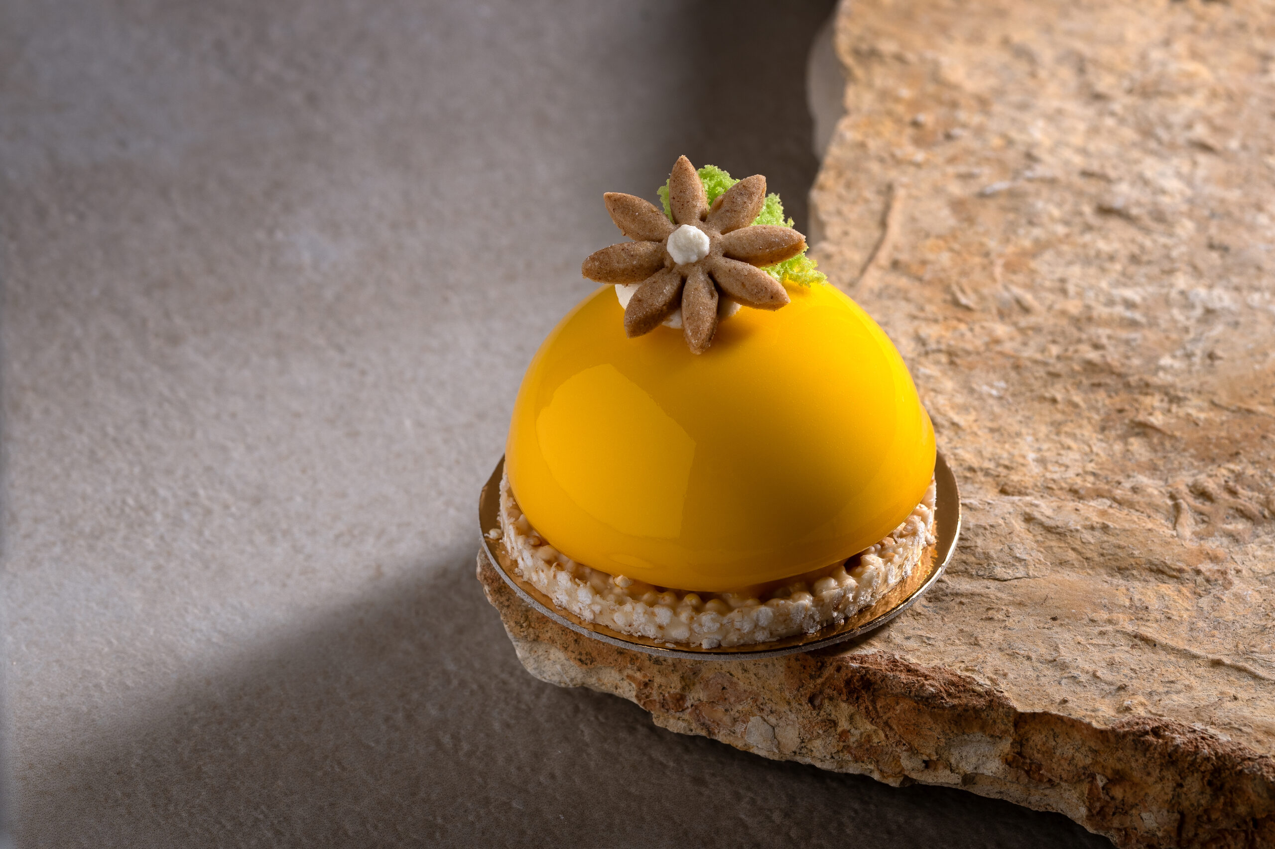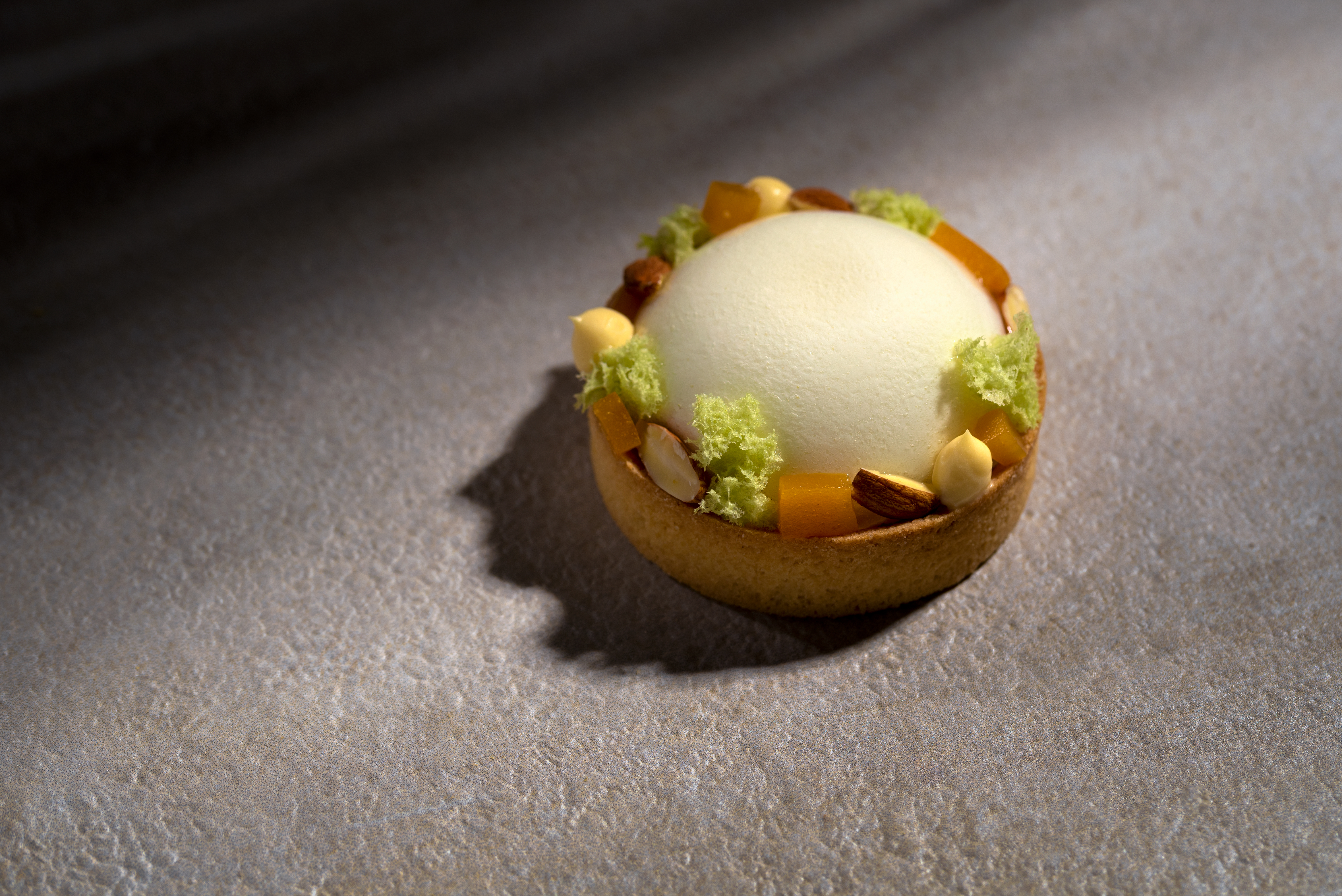Roppanós mandulás linzer kosárban kaffir limeal ízesített cukrászkrém és mandulás genoise piskóta, tört mandula darabokkal, tetején pedig sárgabarack zselé könnyű joghurt mousse köntösben.