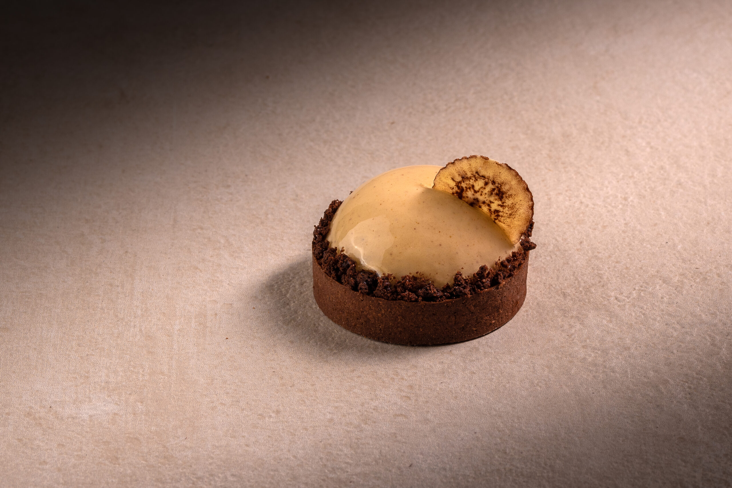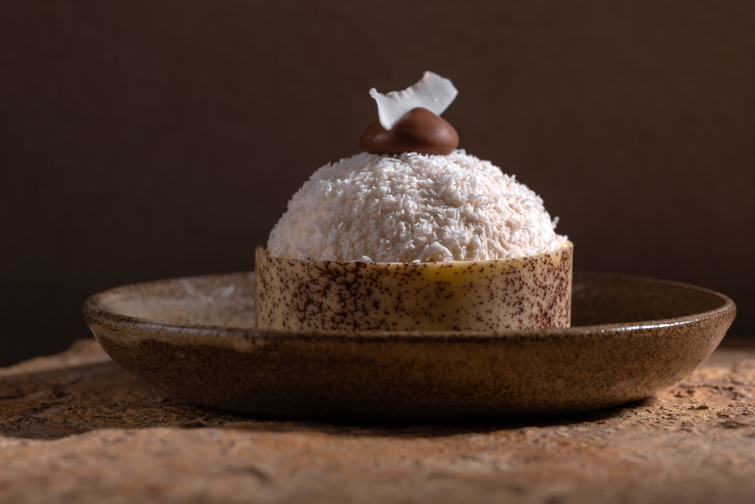 Szaftos étcsokoládés piskóta, rajta egy kakaóbabtöretes ropogós réteg, lágy tejcsokoládés krém és egy könnyű kókuszmousse.