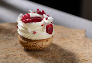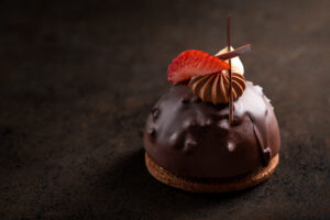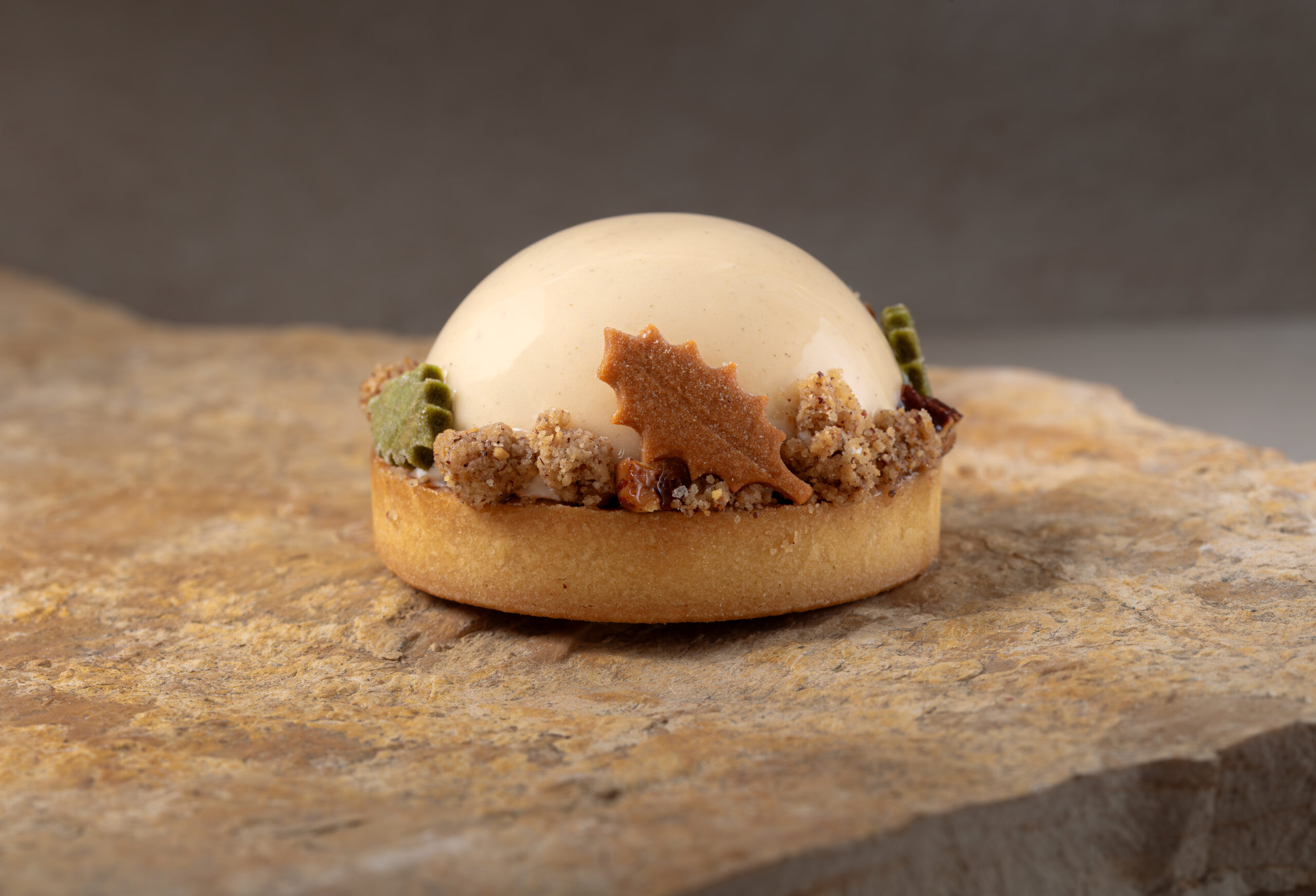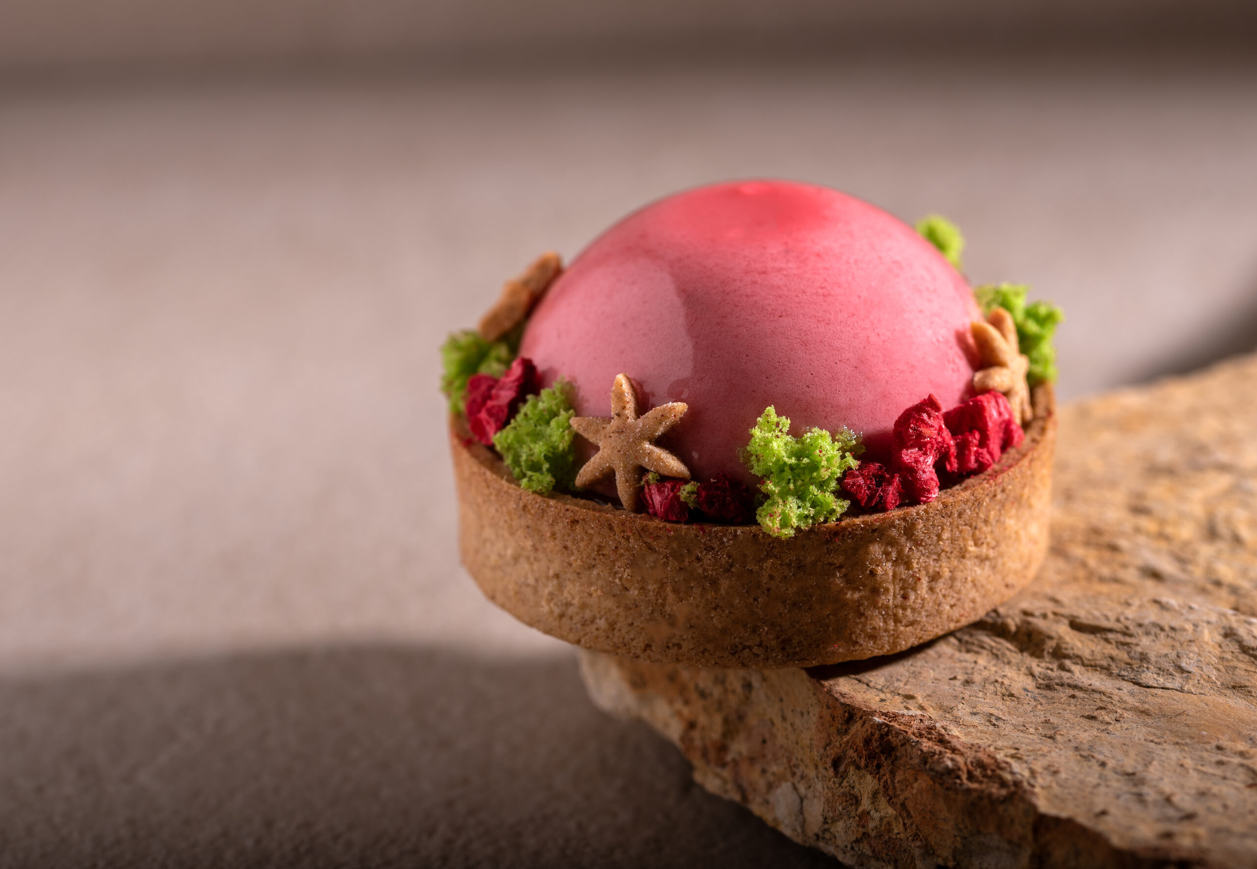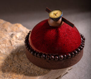 Roppanós kakaós sablé keksz, piskóta zabpehellyel, borókabogyós krém, eperzselé, étcsokoládé mousse kakaóbabtöretes csokoládéval bevonva.